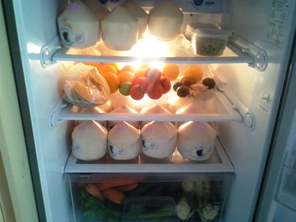 3 coconuts, 3 large glasses of green smoothie (our kids shared one glass), 5 carrots, 5 cucumbers, 4 apples, 10 bananas, 4 passion fruit, 3 portions of miso soup with vegetables, 2 bowls of green salad, 1 egg, 3 large glasses of green juice, lettuce, 6 tomatoes with raw cheese, 2 pieces of goji berry cake left over, 10 kale leaves, 2 avocados, 1 red bell pepper, flaxseed meal. All at approximate costs of  $46 AUS. All home made and organic products!